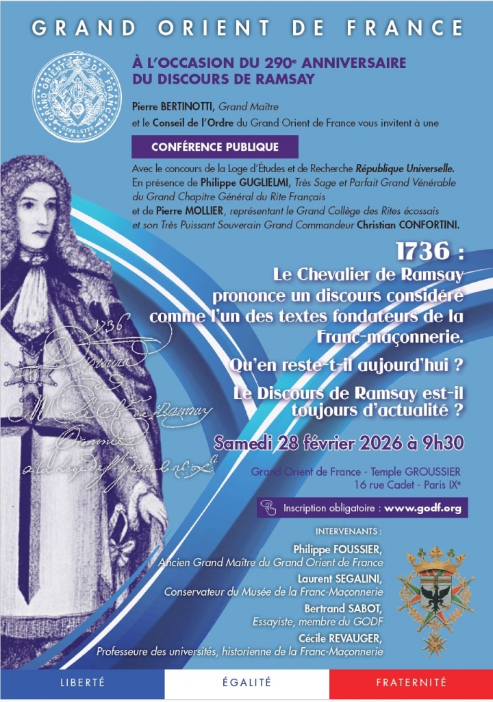 Organisée à l’occasion du 290e anniversaire du discours de Ramsay, l’un des textes fondateurs de la Franc-maçonnerie. Qu’en reste-t-il aujourd’hui ? Le Discours de Ramsay est-il toujours d’actualité ?